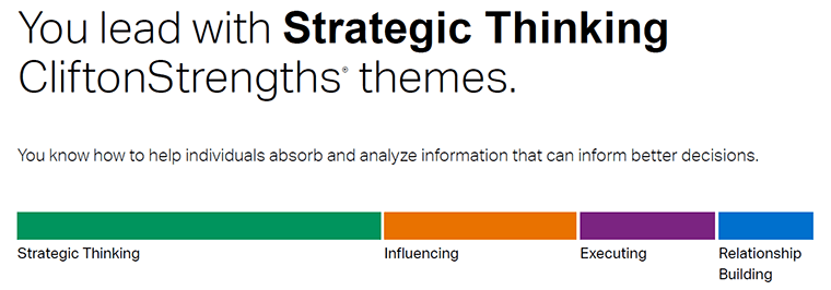 Gallup®, CliftonStrengths®, Clifton StrengthsFinder®, StrengthsFinder® and each of the 34 strengths theme names are trademarks of Gallup, Inc.